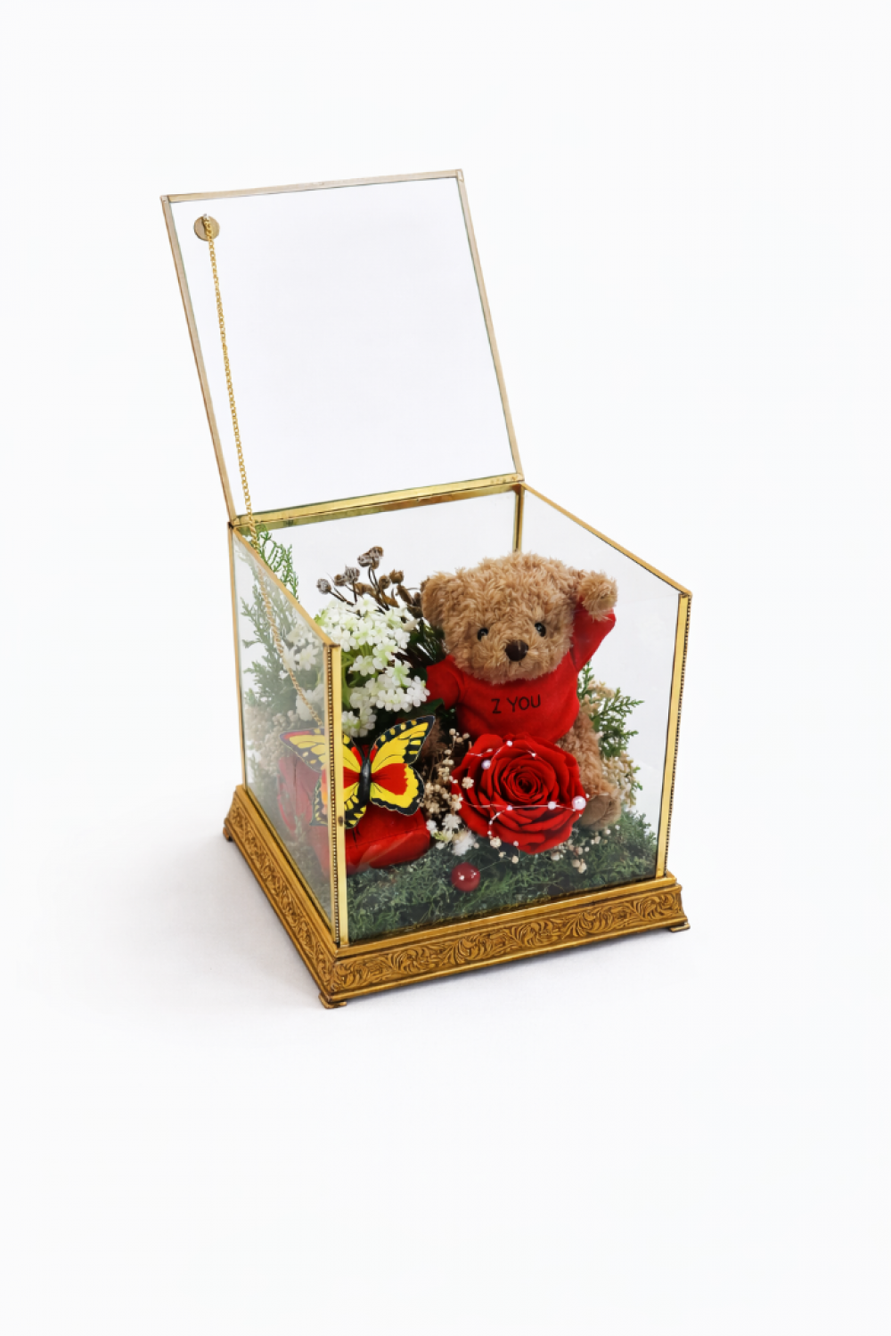 Cam kutu içinde ayıcıklı kırmızı gül aranjmanı, aşkı ve duyguyu kalıcı bir hatıraya dönüştüren özel bir tasarımdır. Altın detaylı şeffaf cam kutu içerisinde yer alan canlı kırmızı gül, sevimli ayıcık figürü ve dekoratif yeşillikler ile tamamlanarak göz alıcı bir sunum oluşturur.